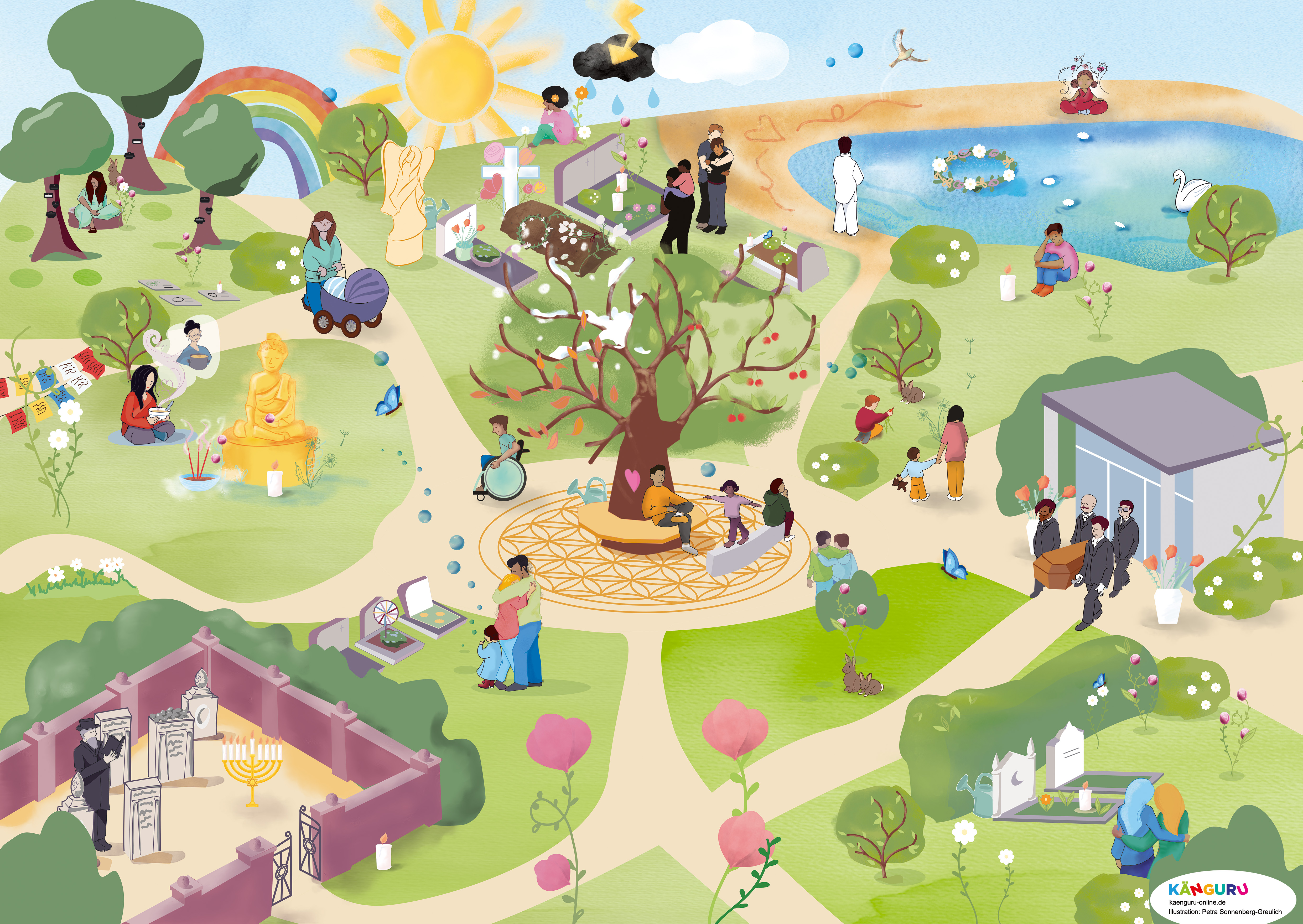 Das Wimmelbild von Petra Sonnenberg zeigt einen Friedhof auf dem Menschen verschiedener Kulturen, Religionen und auch ohne Glauben nebeneinander Ruhe finden – ein Ort, an dem Trauer, Erinnerung und Gemeinschaft zusammenkommen.