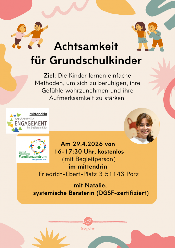 In diesem spielerischen Workshop lernen Kinder einfache Achtsamkeitsübungen kennen, die ihnen helfen, sich besser zu konzentrieren, mit starken Gefühlen umzugehen und zur Ruhe zu kommen. Durch Bewegung, kleine Fantasiereisen und kurze Übungen erfahren sie, wie sie ihren Körper und ihre Gedanken bewusst wahrnehmen können.