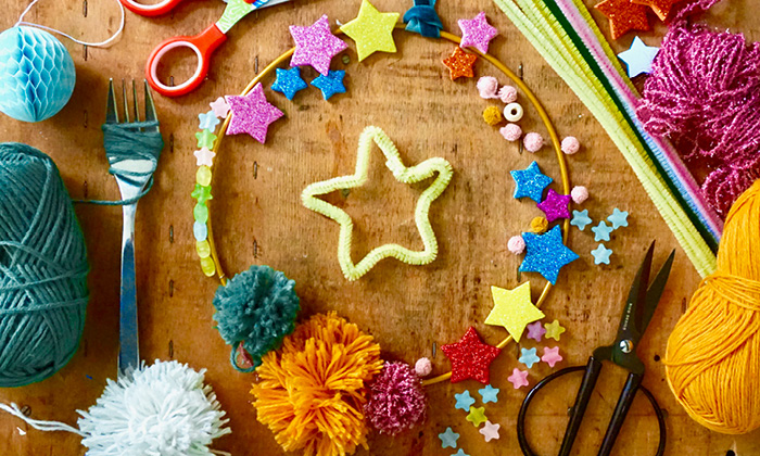 Auf einem Metallring gestaltet ihr euren ganz persönliche Weihnachtsdeko – mit selbstgebastelten Ponpoms, bunten Bändern, Perlen, Wabenbällen und viel weiterem Deko-Material. Jeder Kranz wird so zu einem echten Unikat! Ihr lernt verschiedene Techniken, wie man aus Wolle Pompon-Bälle bastelt und ihr bekommt viele weitere Ideen, wie ihr euren Kranz schmücken könnt.