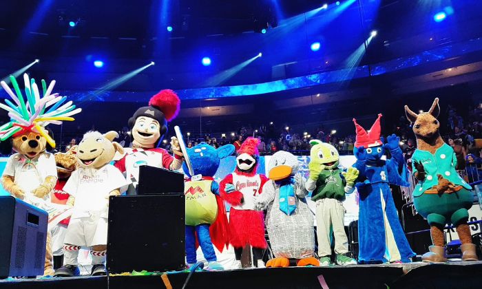 Unsere Karla Känguru und andere Walking Acts wie z.B. Hennes (1.FC Köln), Jecko (Festkomitee Kölner Karneval), Sharky (KEC) präsentieren sich beim großen, viel umjubelten Einmarsch mit rund 1.000 Pänz der Kölschen Kinder- und Jugendtanzgruppen.