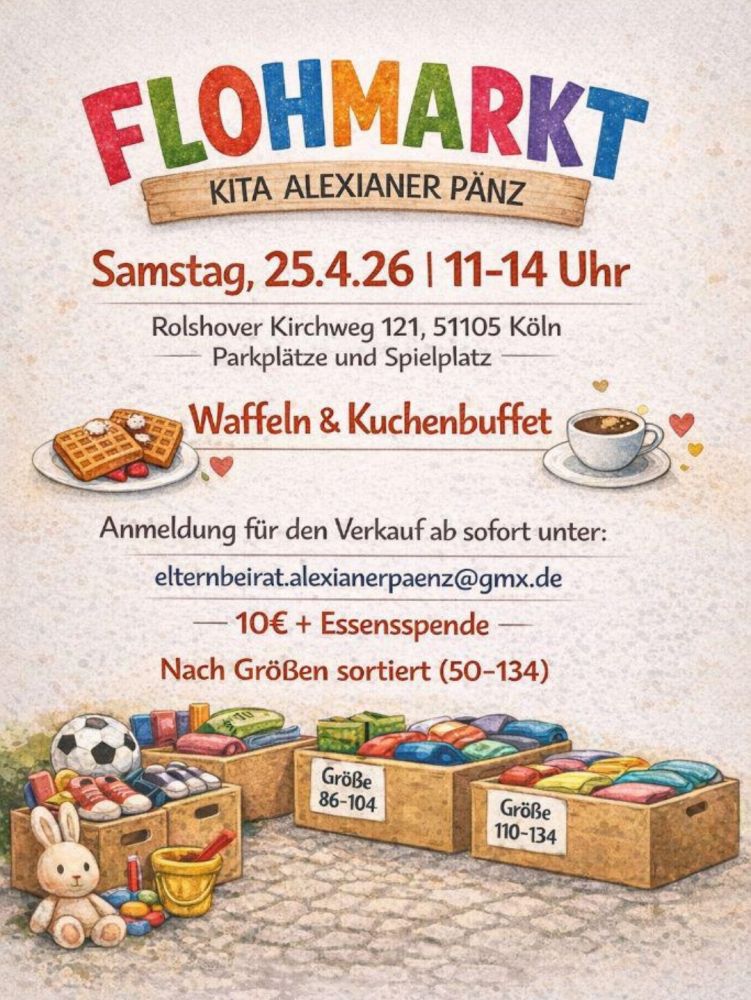 Flomarkt rund ums Kind mit vielen Ständen mit Kleidung Größe 50 bis 134 und Spielsachen in der Turnhalle, und bei schönem Wetter draußen.