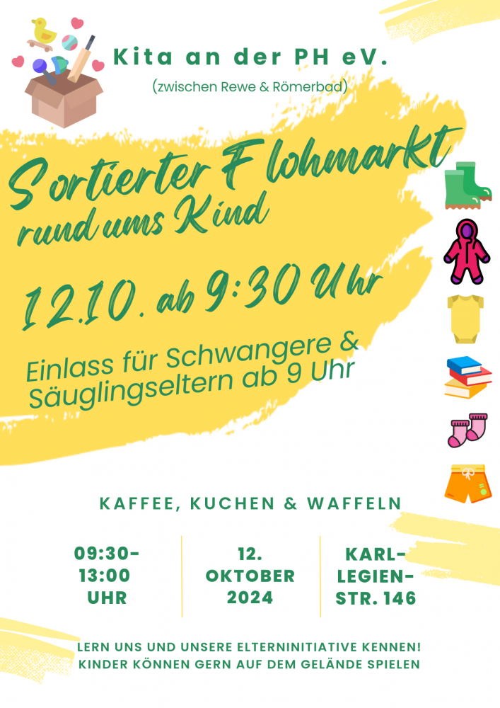 Sortierter Flohmarkt mit Baby- & Kinderkleidung, Spielwaren und Zubehör.