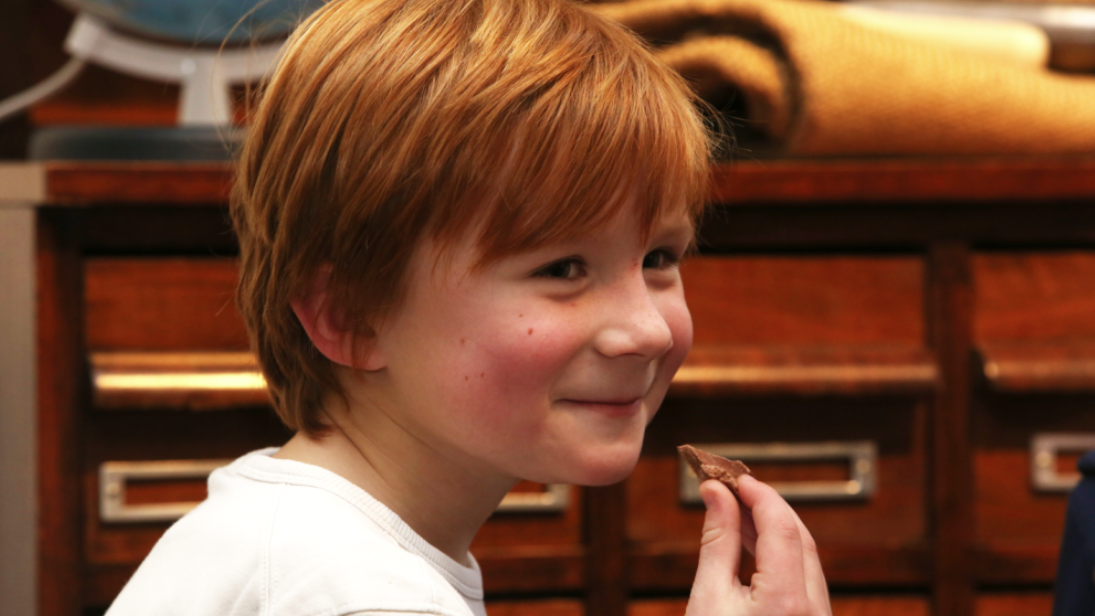 Selbstverständlich dürft Ihr auch eine echte Kakaobohne schälen und probieren. Zum Abschluss könnt Ihr in unserer gläsernen Schokoladenfabrik sehen, wie Schokolade heute hergestellt wird.