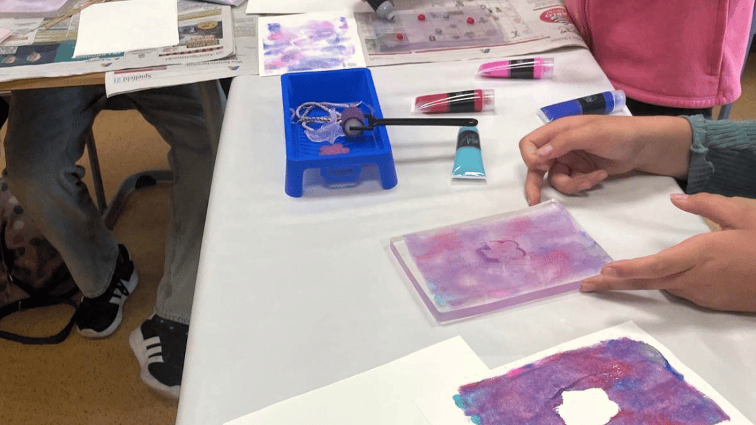 Anschließend wird mit einem tollen Druckverfahren experimentiert. Mit Gelli-Platten können die Teilnehmer:innen nach Herzenslust Drucke anfertigen und die wunderschönen Ergebnisse mit nach Hause nehmen.