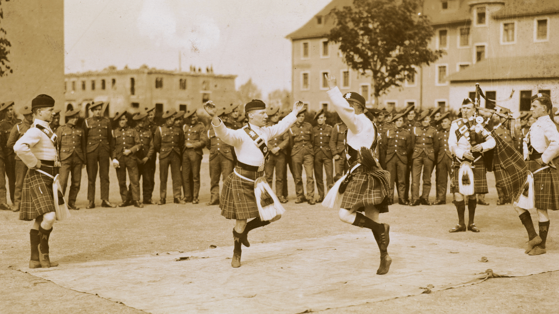 Schottische Besatzungssoldaten mit ihren Kilts tanzen auf dem Kasernenhof in Riehl. Foto von Eugen Bayer, KSM, © HAStK-RBA
