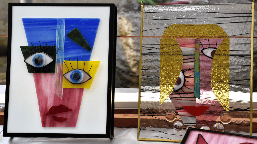 Glaskunst und gläsernes Kunsthandwerk wird präsentiert und zum Kauf angeboten.
