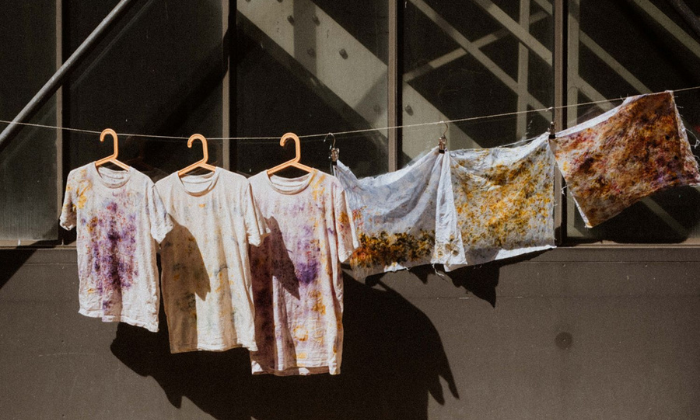 Im Studio wird mit der sogenannten Bundle-Dye-Technik gearbeitet – dabei entstehen aus Blüten, Extrakten und Rinden individuelle Farb- und Mustereffekte.