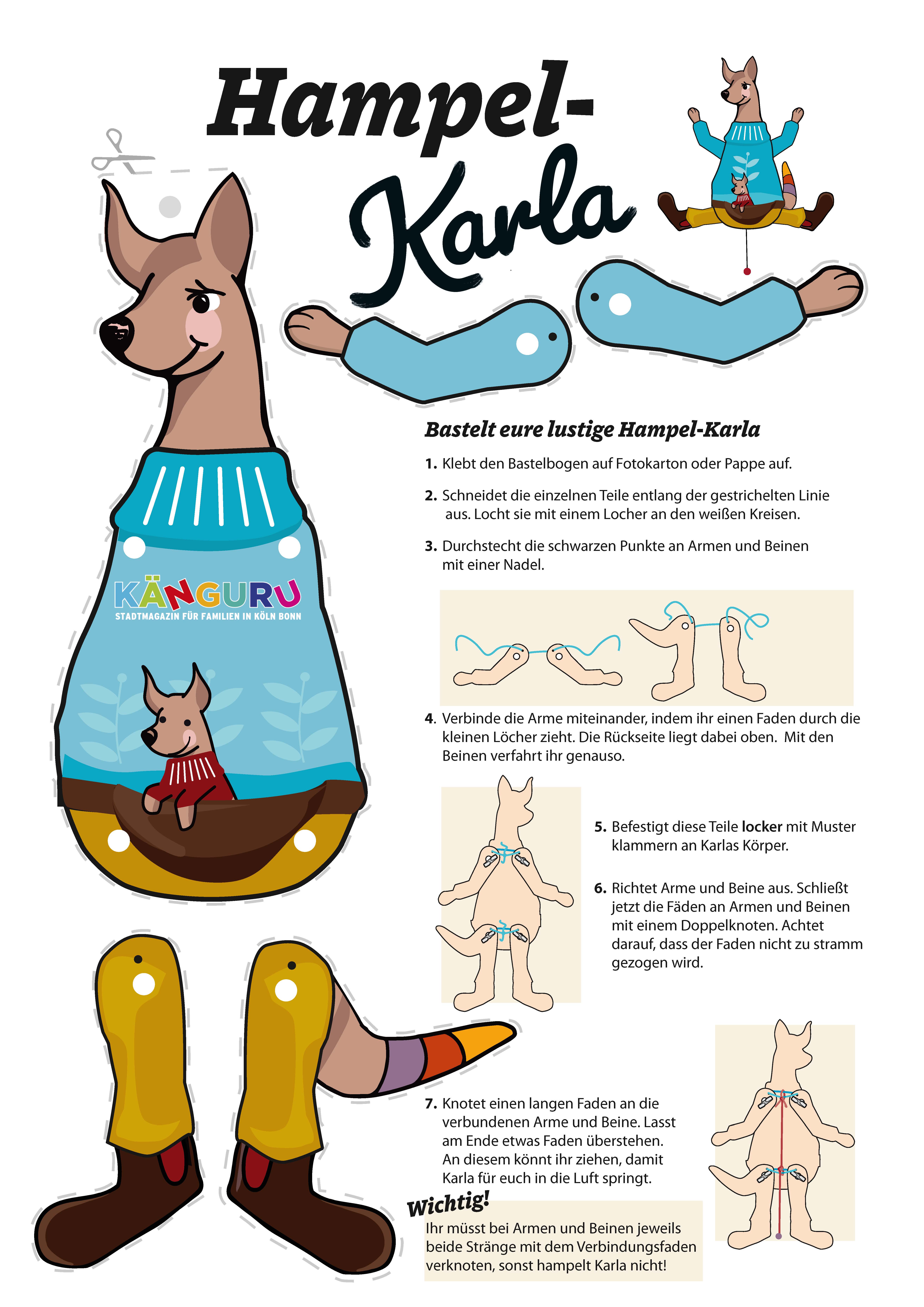 Bastelt euren eigenen Karla Känguru Hampelmann! Der Bastelbogen zeigt Karla in Bewegung und lädt euch ein, sie mit euren Händen zum Leben zu bringen. Einfach herunterladen, ausschneiden, zusammenbauen – und Spaß haben!