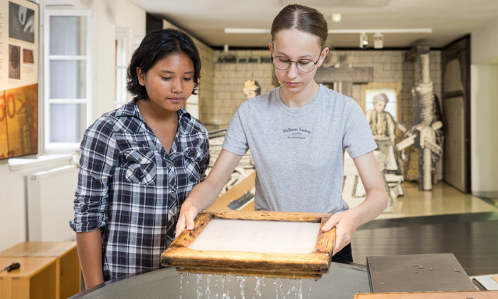 Erst erfolgt ein Rundgang durch die Papiermühle. Dort wird dann auch Papier geschöpft. Es gibt im Anschluss verschiedene Bastelaktionen. Diese sind optional.