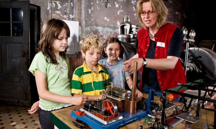 Die Kinder schauen sich an, wie Antrieb und Schleiferei in der Firma Hendrichs funktionierten. Dann bauen sie das Modell einer Transmissionsanlage. Aus einfachen Materialien fertigen sie eine Antriebskurbel, Wellen und Transmissionsbänder, die einen selbstgebauten Schleifstein antreiben.