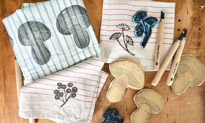 Mit deinem selbst geschnitzten Stempel gestaltest du deine eigene Kosmetiktasche und ein Küchentuch.