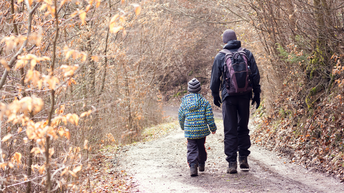 Vater und Sohn wandern durch Laubwald im Winter ©PavlaZakova/AdobeStock