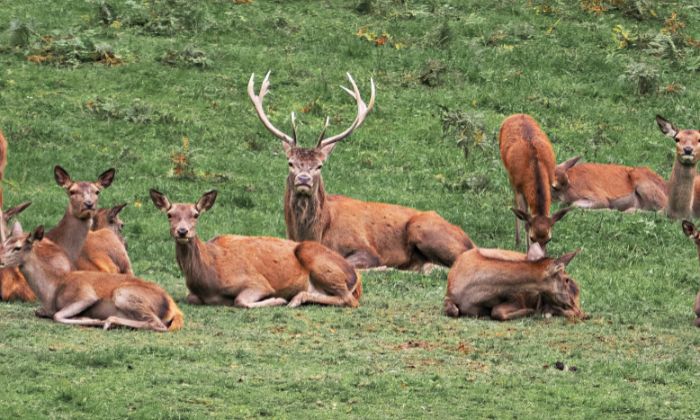 Rotwildherde mit Platzhirsch – auf den weitläufigen Wiesen finden die Tiere im Park genügend Raum. © Sven von Loga