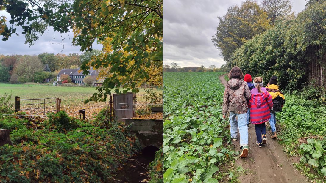 Nun erscheint zu unserer Rechten die Wasserburg Haus Herl, die dieses Jahr ihren 1.000 Geburtstag feiert. Beeindruckend. Die Burg ist in privater Hand und heute nicht zu besichtigen. Die Meute freut sich trotzdem: über die Gänse und die Wassergräben und malt sich aus, wie hier Ritter damals die Burg verteidigt haben. Wir wechseln kurz die Straßenseite, laufen parallel am Faulbach entlang und überqueren eine kleine Holzbrücke. Hier hängen sich die Kids übers Gelände. Janosch ist überzeugt, ein Krokodil gesehen zu haben. Jauchzend suchen alle fieberhaft nach dem Reptil. Nun erblicken die Entdecker:innen auch Aale und Forellen, selbst ein Hai wurde gesichtet. Herrlich. Der Fantasie sind auch hier keine Grenzen gesetzt.